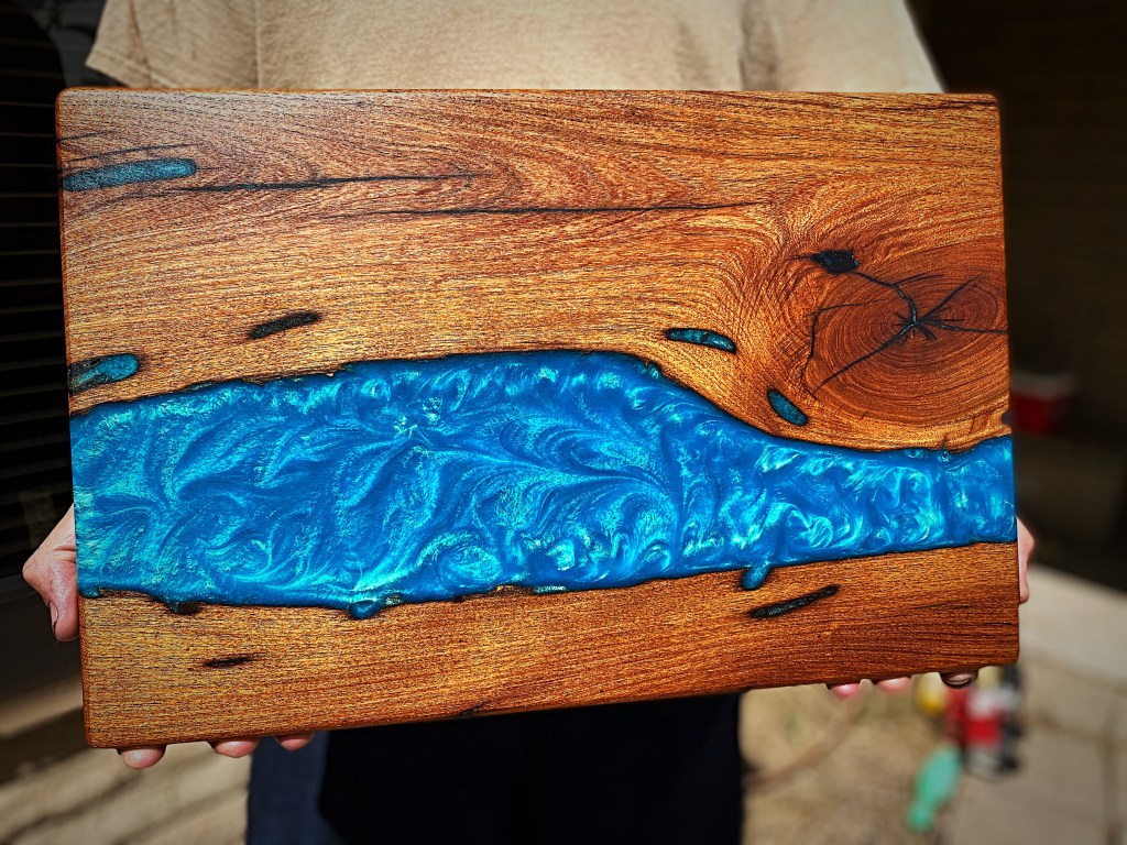 Bryant selected mesquite to make charcuterie boards and put them in both of the forms. We tightened them (but not too tight) with the spacers and crossbars. We used turquoise mica powder (from Just Pigments) and SuperClear Epoxy. We carefully measured the 2 parts of epoxy, mixed them well, and started to pour. It took 2-3 pours to complete the boards.