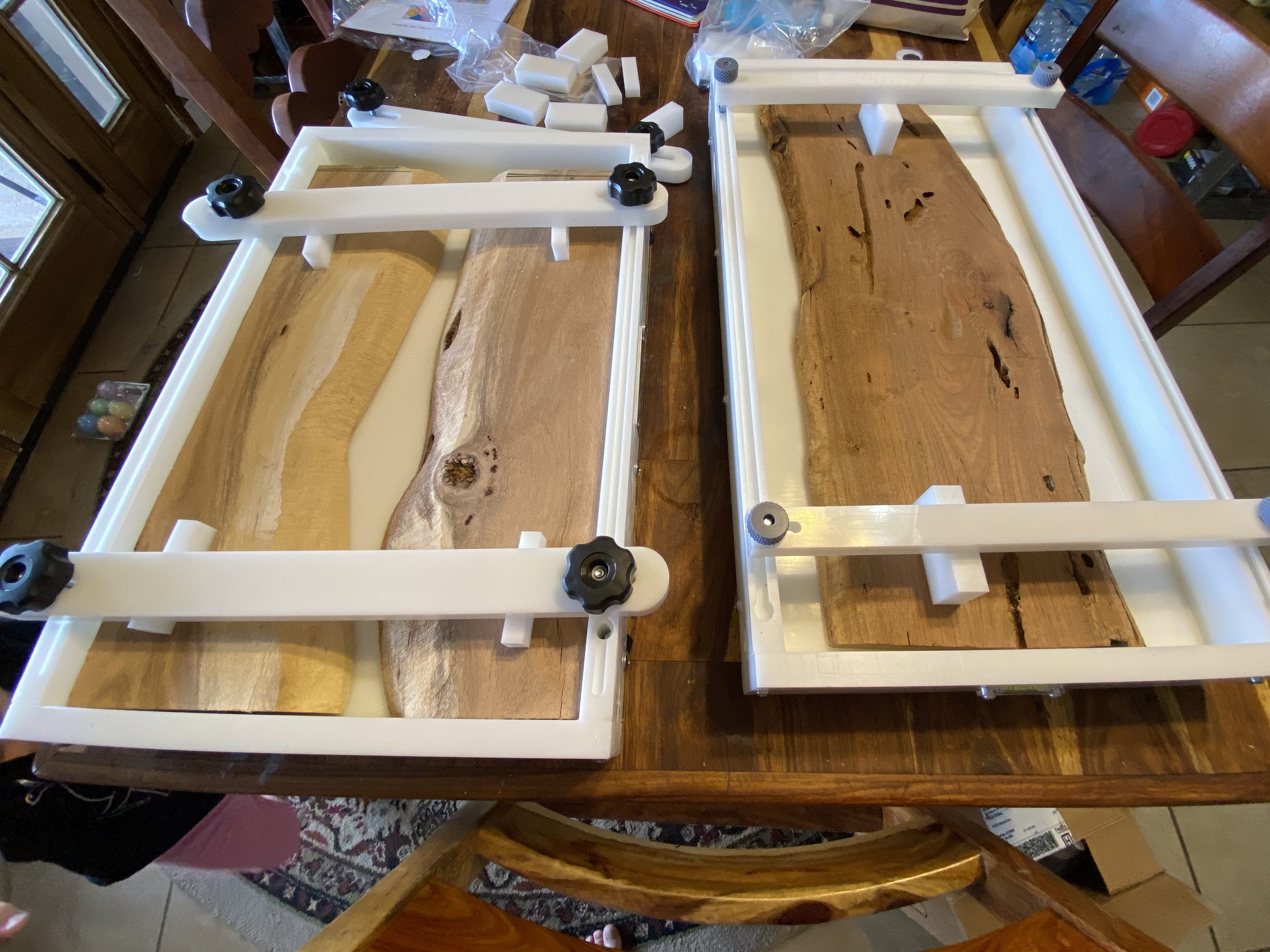 Anybody who has attempted wood and epoxy (or resin) boards has researched the best way to do this. We spent years honing our homemade forms using melamine boards and Tyvek tape. We weighted them down with everything from jade bookends to 5 lb dumbbells (now all covered in epoxy). We had our fair share of leaks from poorly sealed and overused forms. We knew there had to be a better way and we were finally ready to shell out some money for pre-made forms that promised to make our epoxy/wood lives easier.