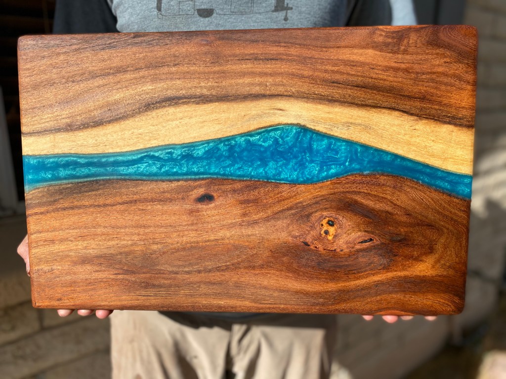 Next, we decided to do an old design favorite but bring back the real crushed turquoise. We brought back our Tree of Life design on a piece of Indian Rosewood. Years ago we acquired a good amount of Kingman and Sleeping Beauty Turquoise in rough form. We get to use heavy hammers to crush them into powder and small pieces. The finished board sold from Instagram the same day!