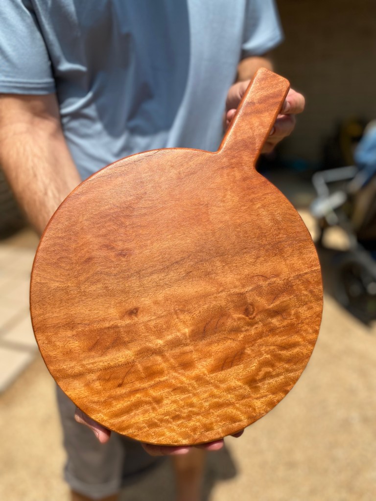 First we decided to try cutting out a round board with a handle. We tested it out on a piece of Indian Rosewood and a piece of Mesquite. After crossing our fingers that the dimensions were correct, we let the CNC do the work. We routered the edges for a nice smooth curve, sanded and finished with a foodsafe Odie’s Oil. The Indian Rosewood sold off of Instagram within half an hour.