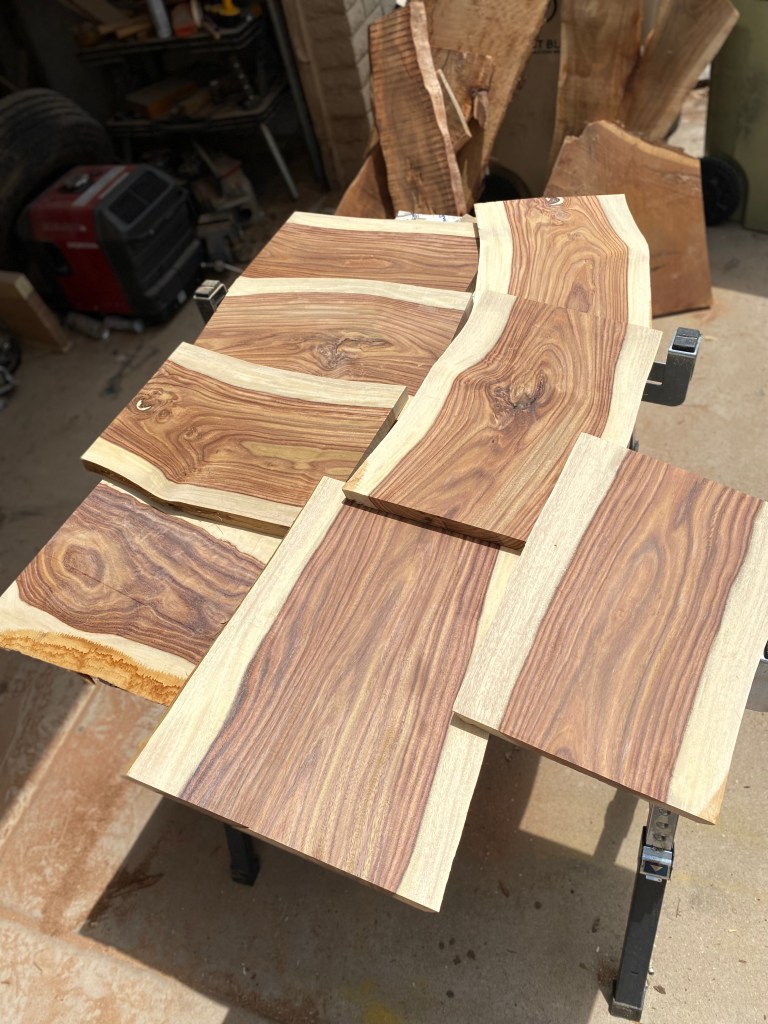 This week, we milled some Sweet acacia from a different tree service pick, the super dry mesquite and African sumac burl. The Sweet acacia had a nail, which is hard on blades, but the slabs still turned out great!