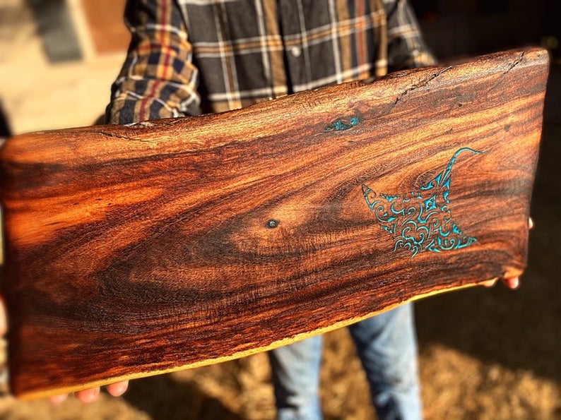 Live edge Acacia Charcuterie Board with Turquoise Stingray – $109