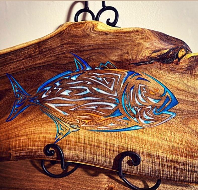 Bluefin Trevally on Figured Live edge Mesquite (20″x11″) – $119
