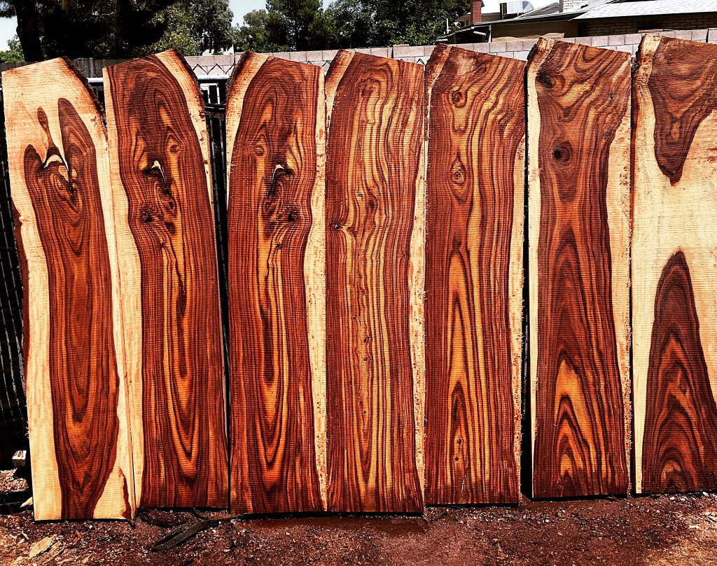 Check out these examples of species that we have available. We have Mesquite, Indian Rosewood, Acacia, Carob, Silk Oak/Leopardwood, Eucalyptus, and Olive. Come out to see what we currently have available!